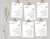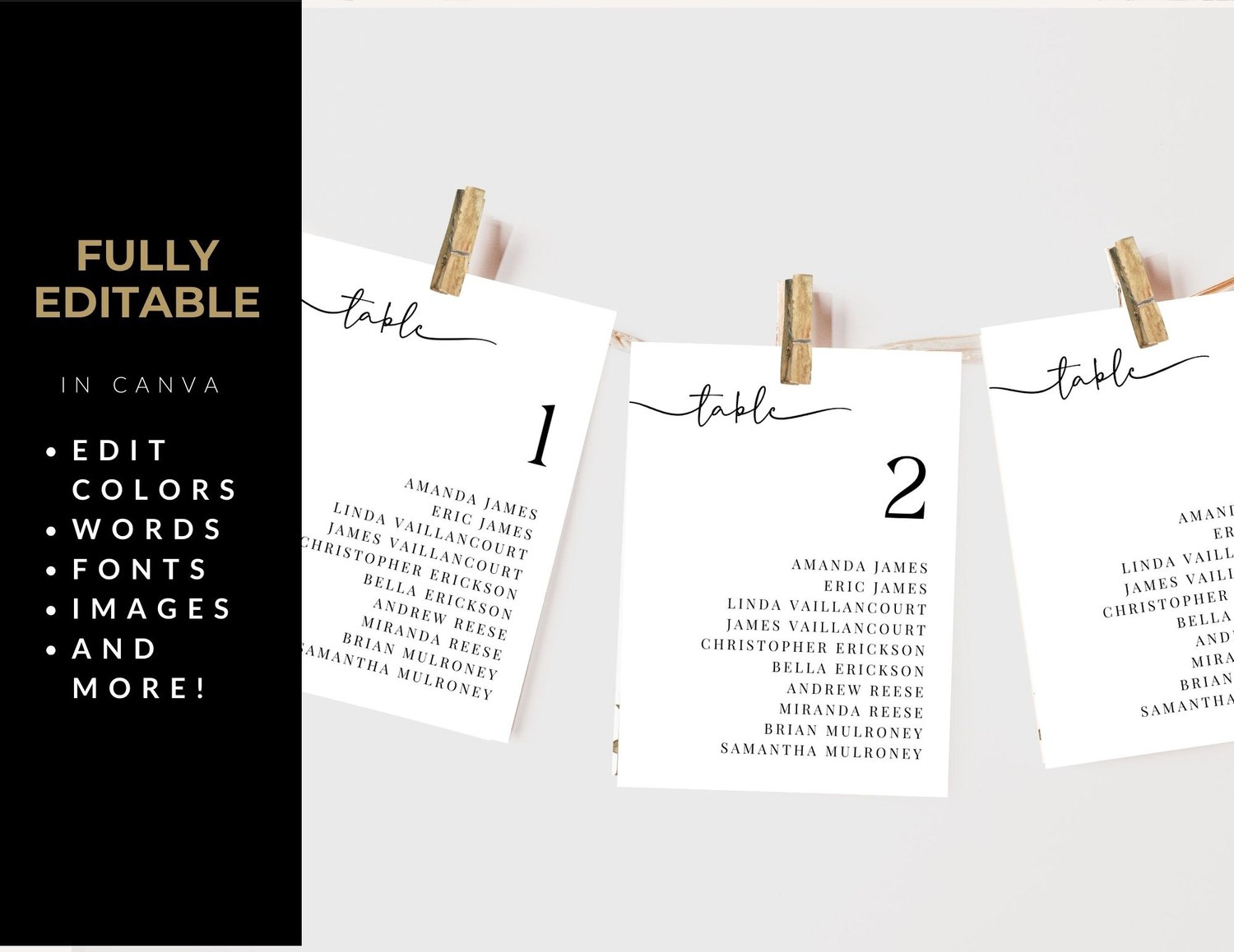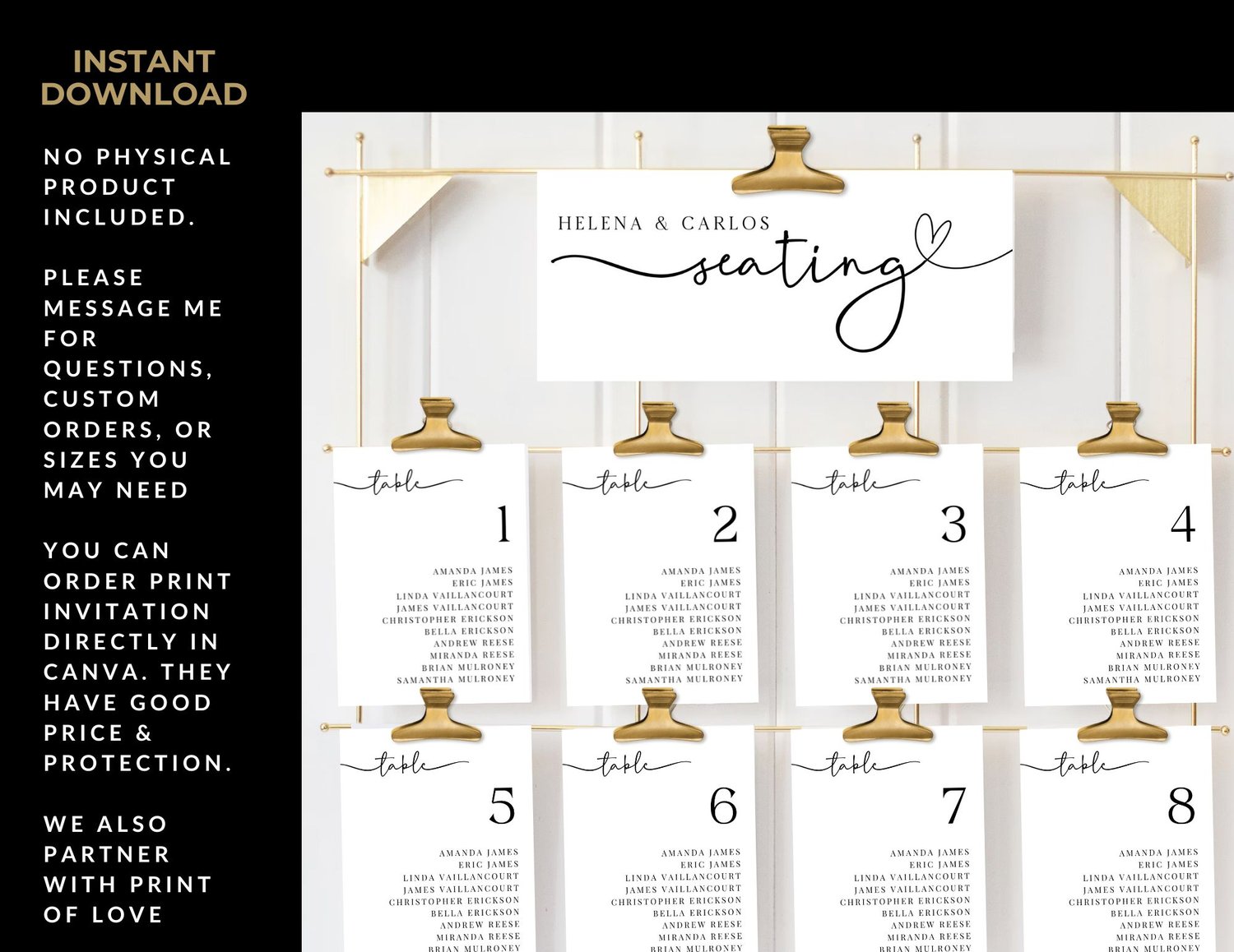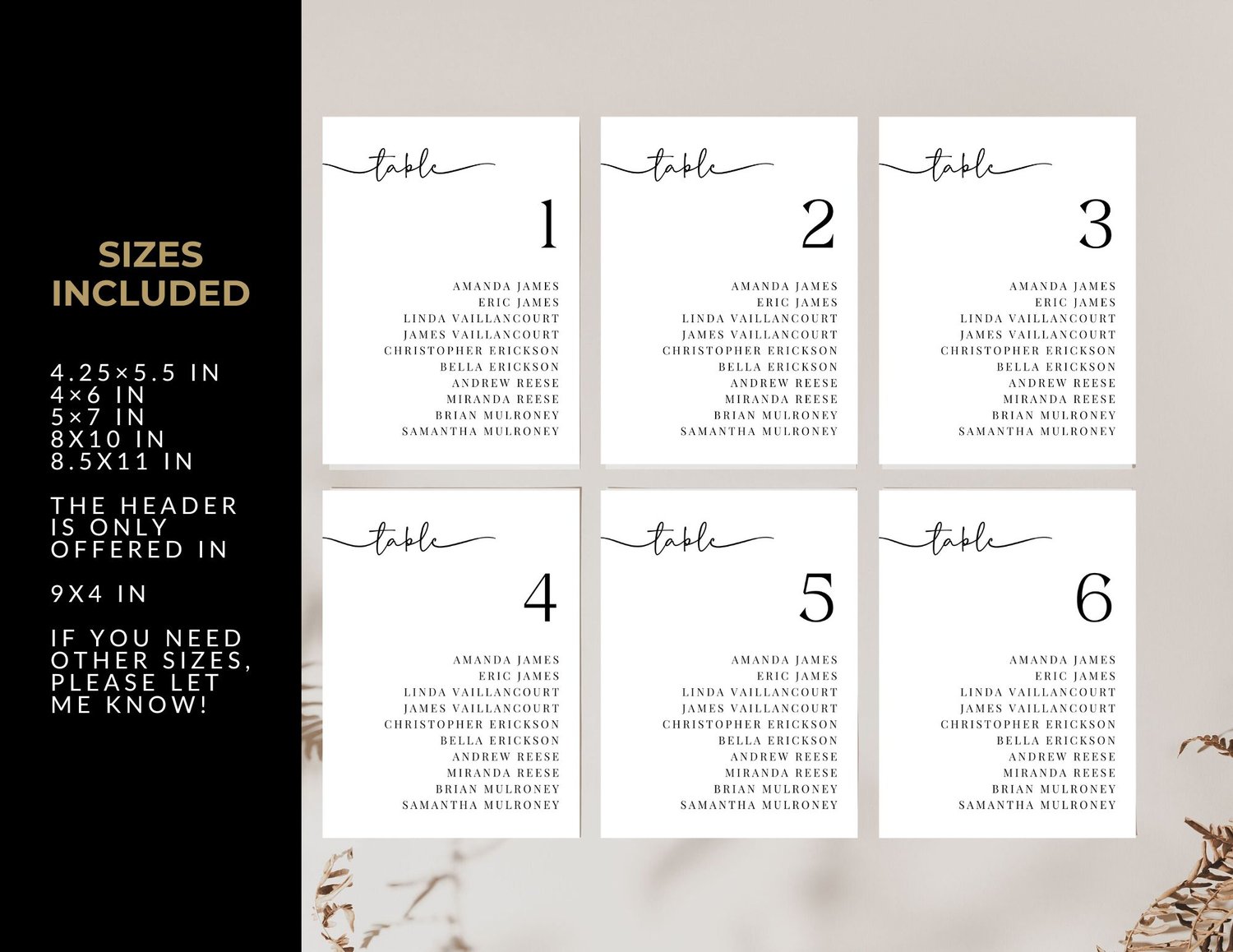 This elegant wedding seating chart template features modern calligraphy and allows you to arrange your seating plan in your own way. Available in sizes 4.25x5.5 inches, 5x7, 4x6, 8.5x11, and 8x10, with an optional 9x4 inch header, this template offers both flexibility and style to perfectly match your wedding decor.