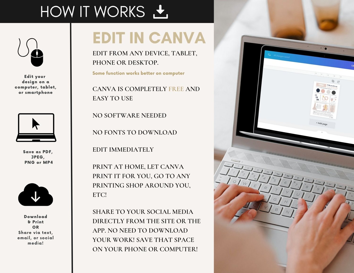 - Receive your product via a Canva link to download it in your preferred format.