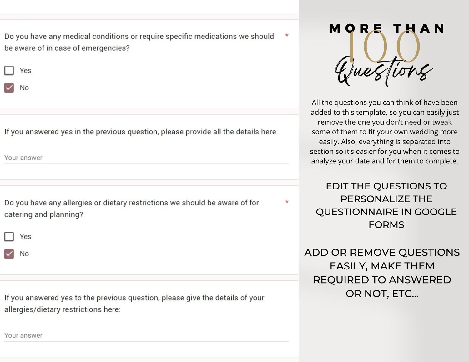1️⃣ Customizable Google Form with 10 Sections: Our Google Form is a game-changer. You have full control to tailor the questionnaire to your preferences. With more than 100 thoughtfully crafted questions, you can dive deep into every detail, ensuring your bridal party understands your vision.