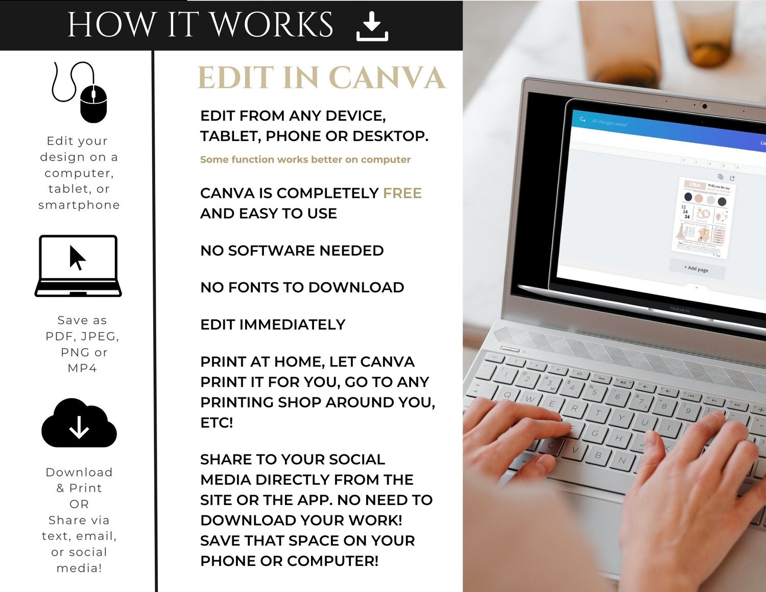 - Receive your product via a Canva link to download it in your preferred format.
