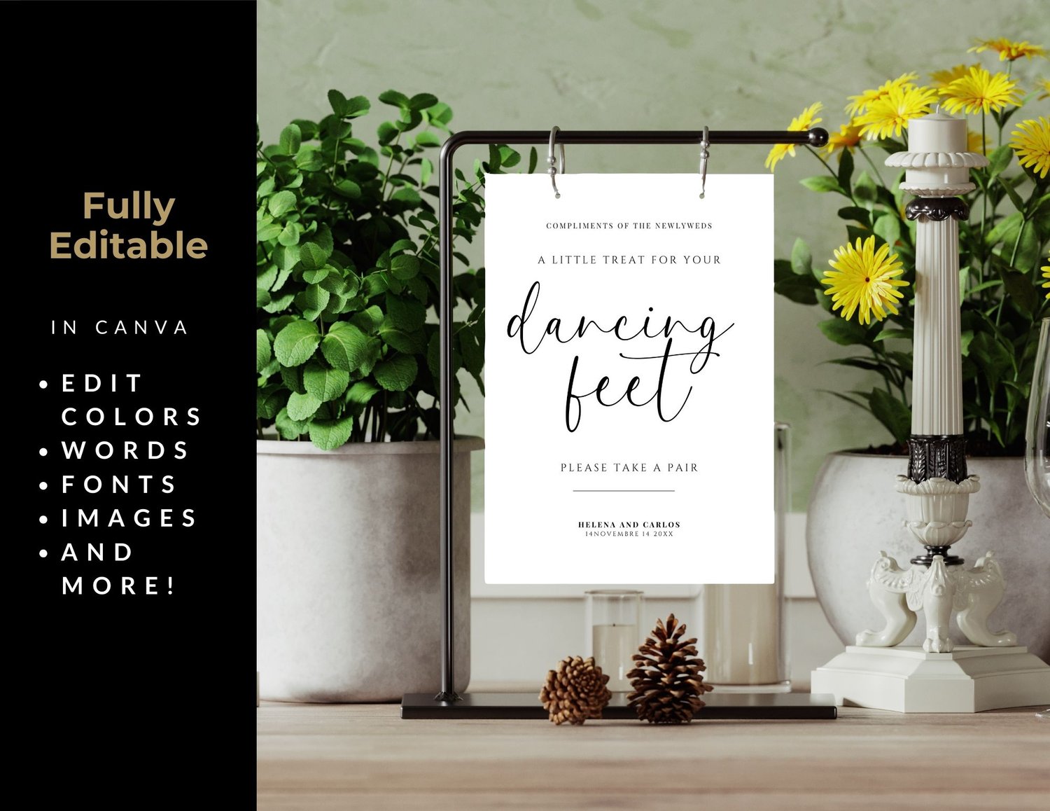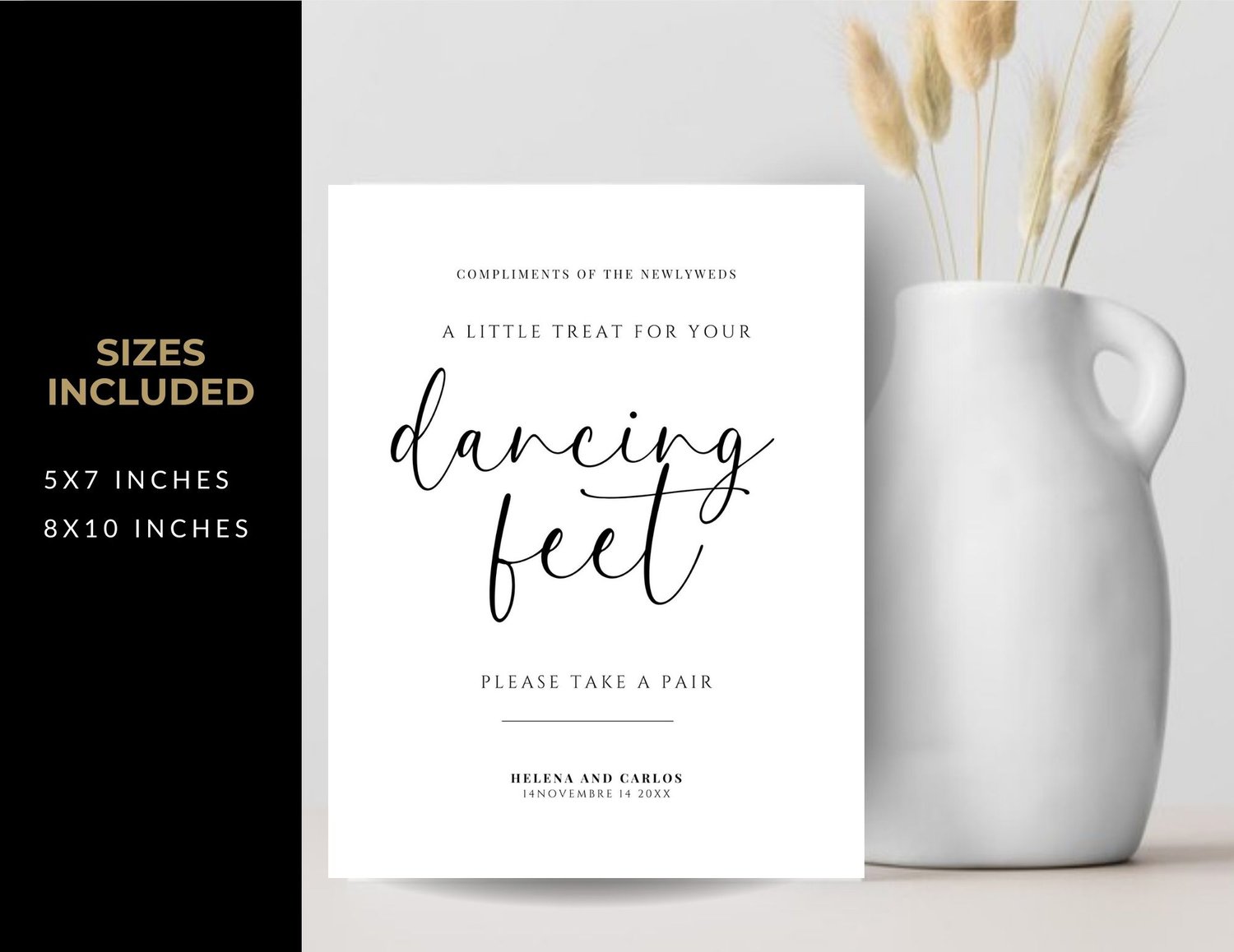 Make your wedding reception extra special with our delightful "A Little Treat for Your Dancing Feet" Sign. Perfectly placed near a selection of comfortable shoes, such as flip-flops, this sign invites guests to swap their formal footwear for something more dance-friendly.