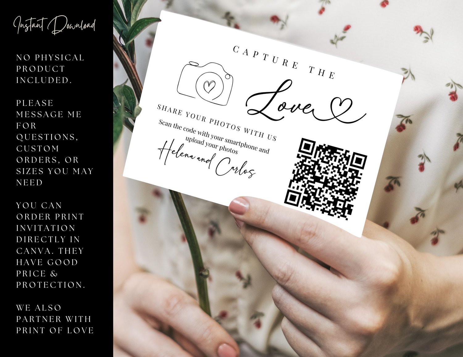 Our "Capture the Love" sign or card is a delightful way to invite your guests to take photos and share them with you. It comes in two convenient sizes: 5.5" x 3.5" and 3.5" x 2". The sign/card features a beautifully designed "Capture the Love" title and a heartfelt message from the bride and groom. What makes it even more special is the customizable QR code that links to your Google account or any platform of your choice for photo sharing.