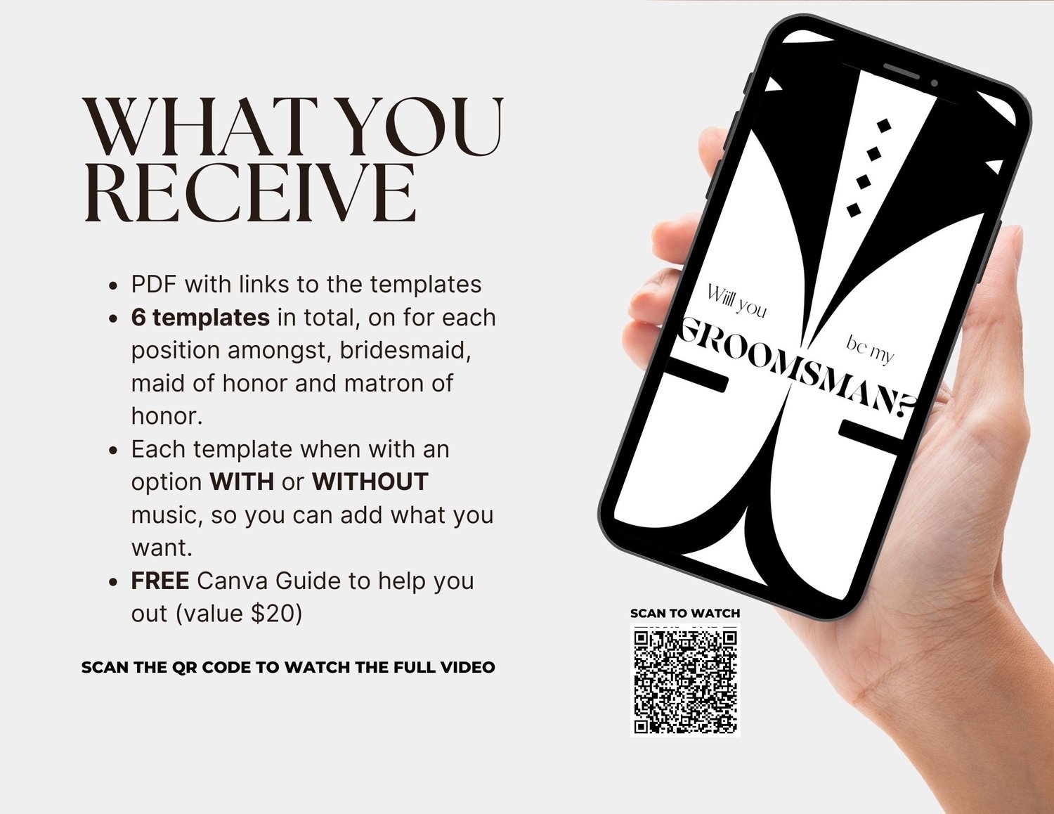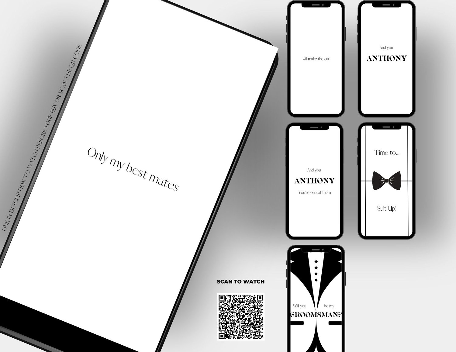 Looking for additional customization or unique features? Explore our custom video options in our boutique's custom orders section. Whether you want custom changes to our template or a completely bespoke groomsman proposal video, we have you covered. You will find these options in the Custom Order section of the boutique.