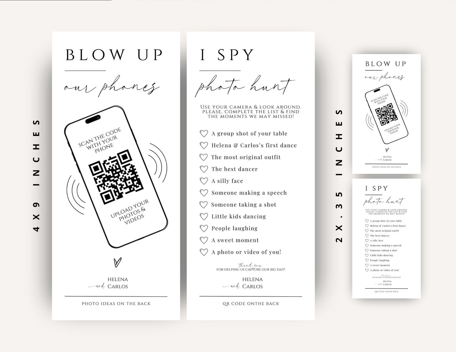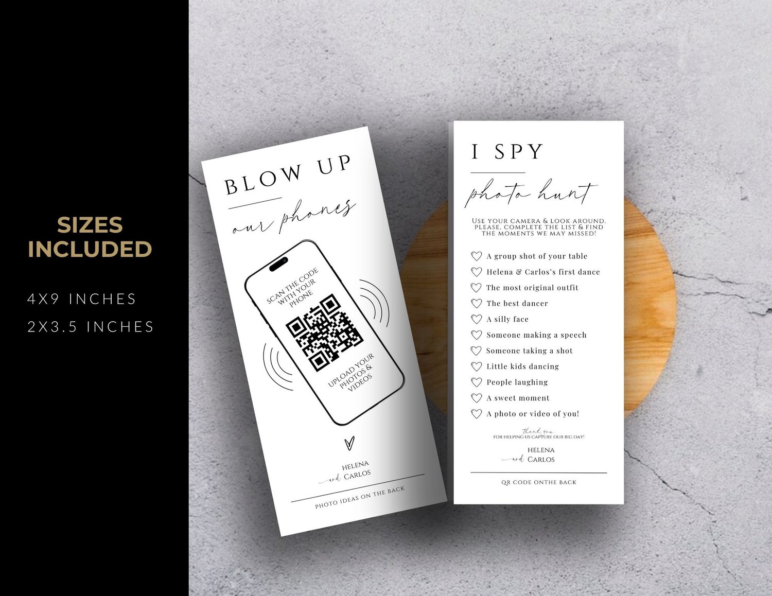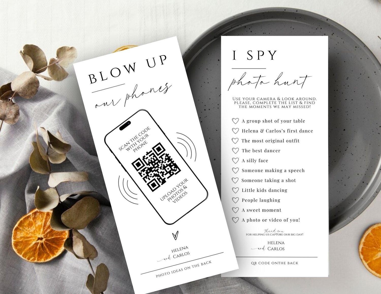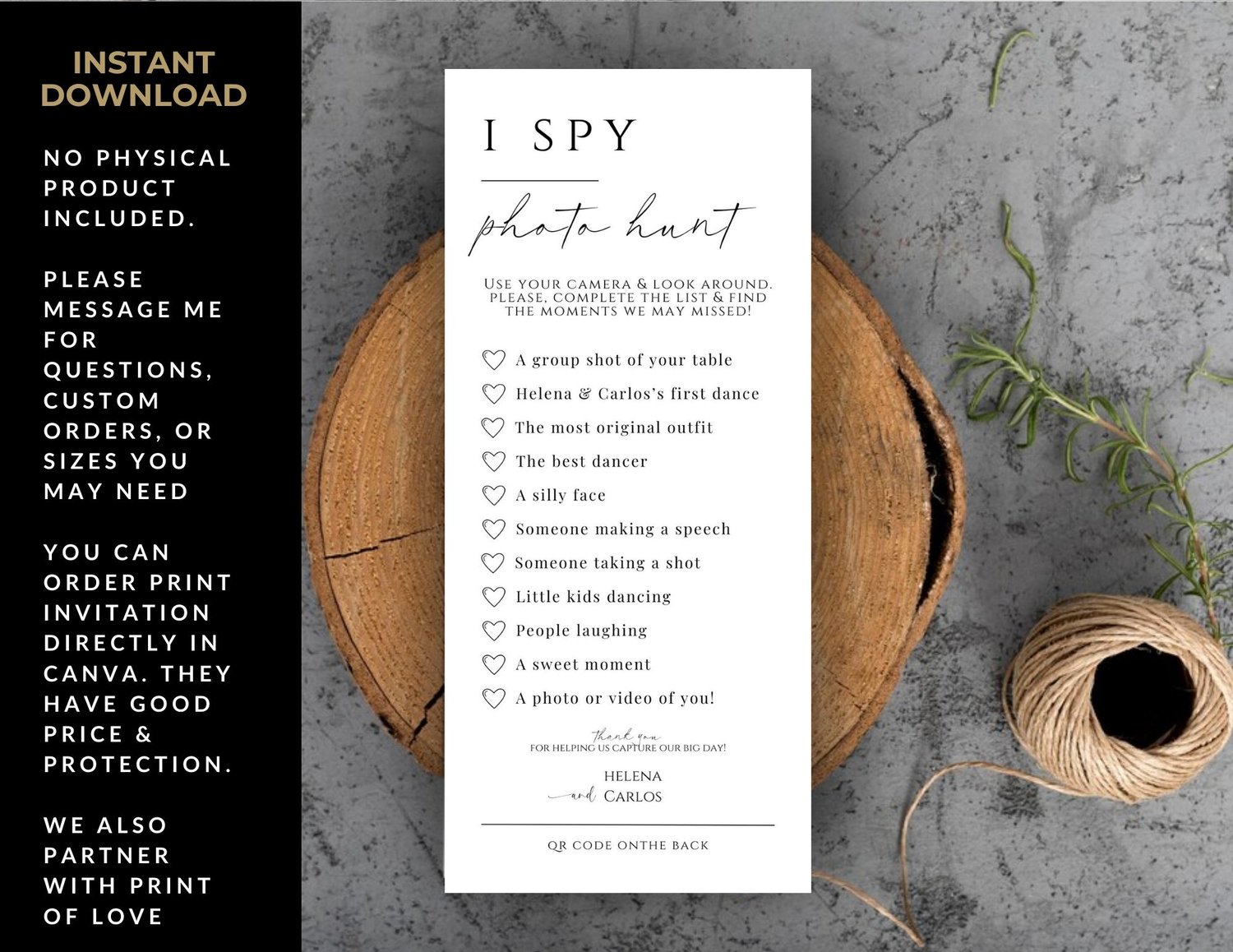Make your wedding day unforgettable and involve everyone in creating a shared photo album filled with laughter, love, and joy. Order your I Spy Wedding Game Cards with QR Code today and add a touch of modern fun to your celebration!