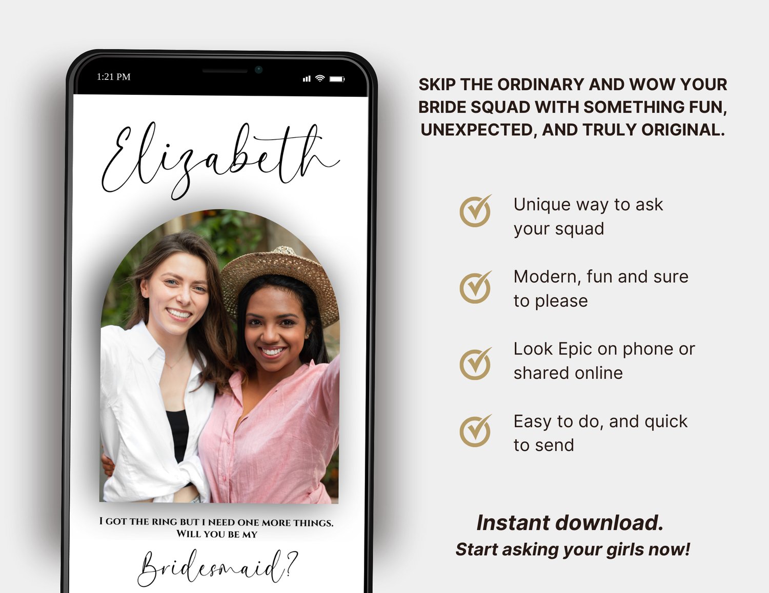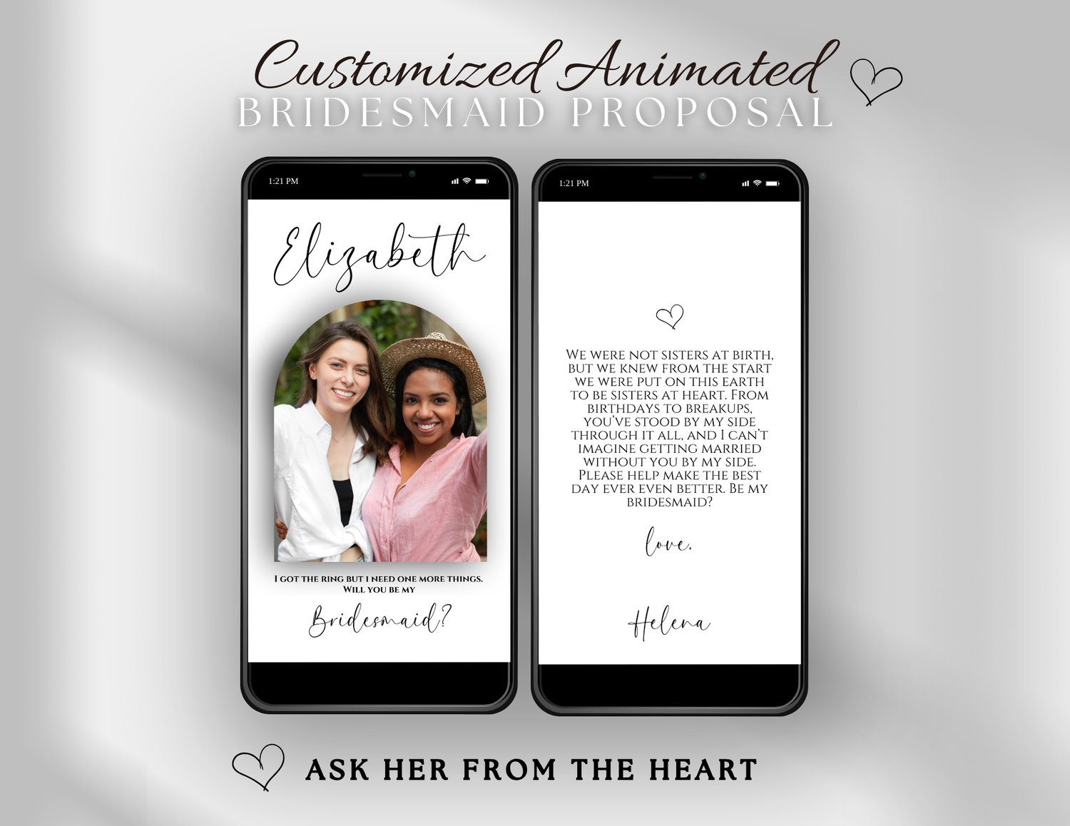 This animated bridesmaid proposal video is a clean, modern way to ask your bridal party to stand by your side. Designed around real photos and simple typography, it focuses on what matters most: the relationship, the message, and the moment.
