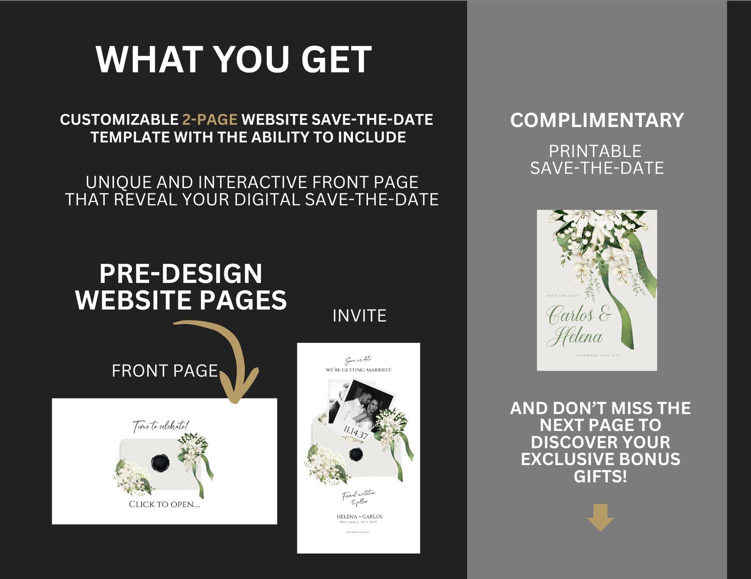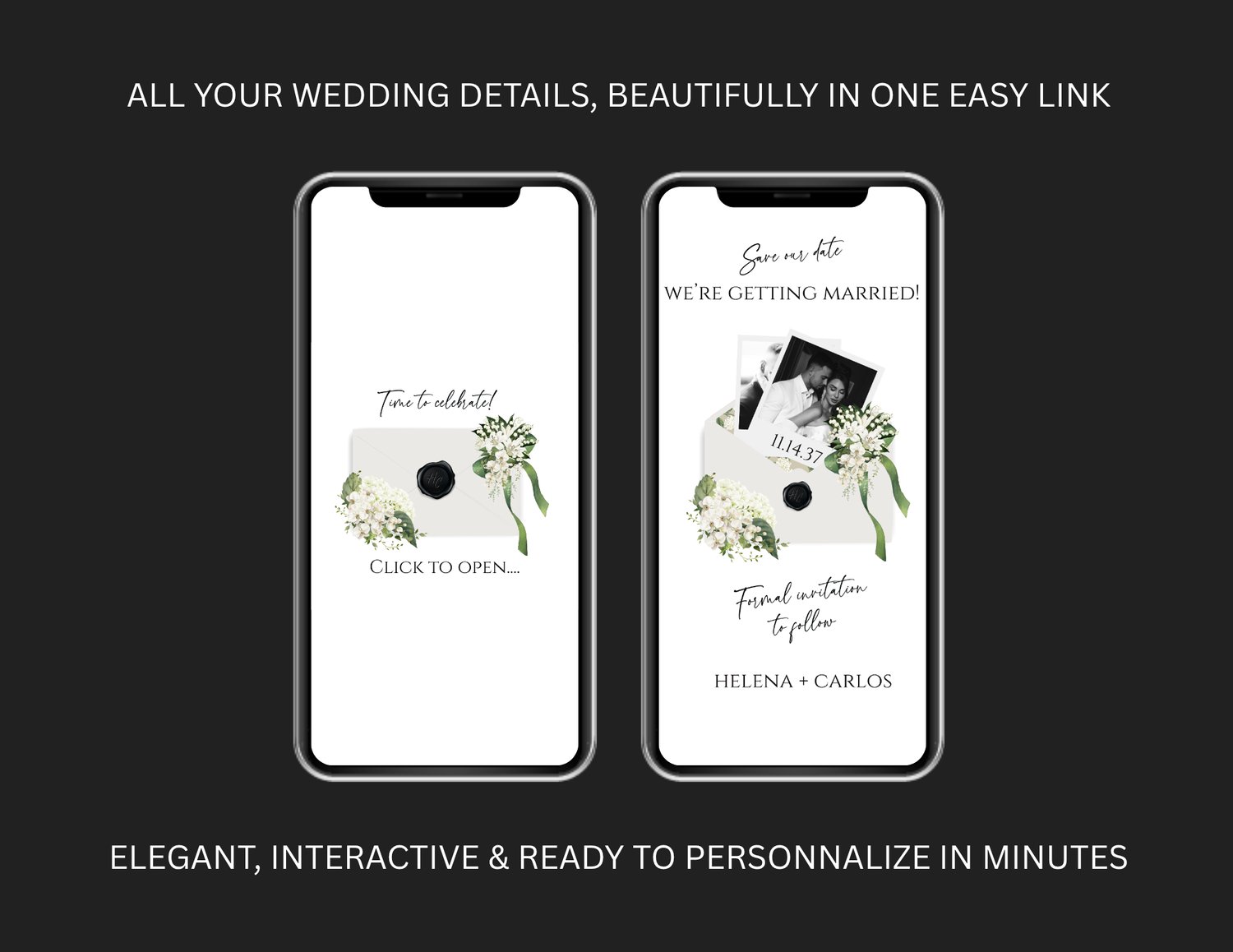 Share your date in the most elegant, modern way with this two-page Digital Save-the-Date Website. Featuring watercolor white florals, fresh greenery accents, and romantic script typography, the experience opens with a charming envelope “click to open” animation and reveals a polished Save-the-Date page with your names, date, and optional photo.