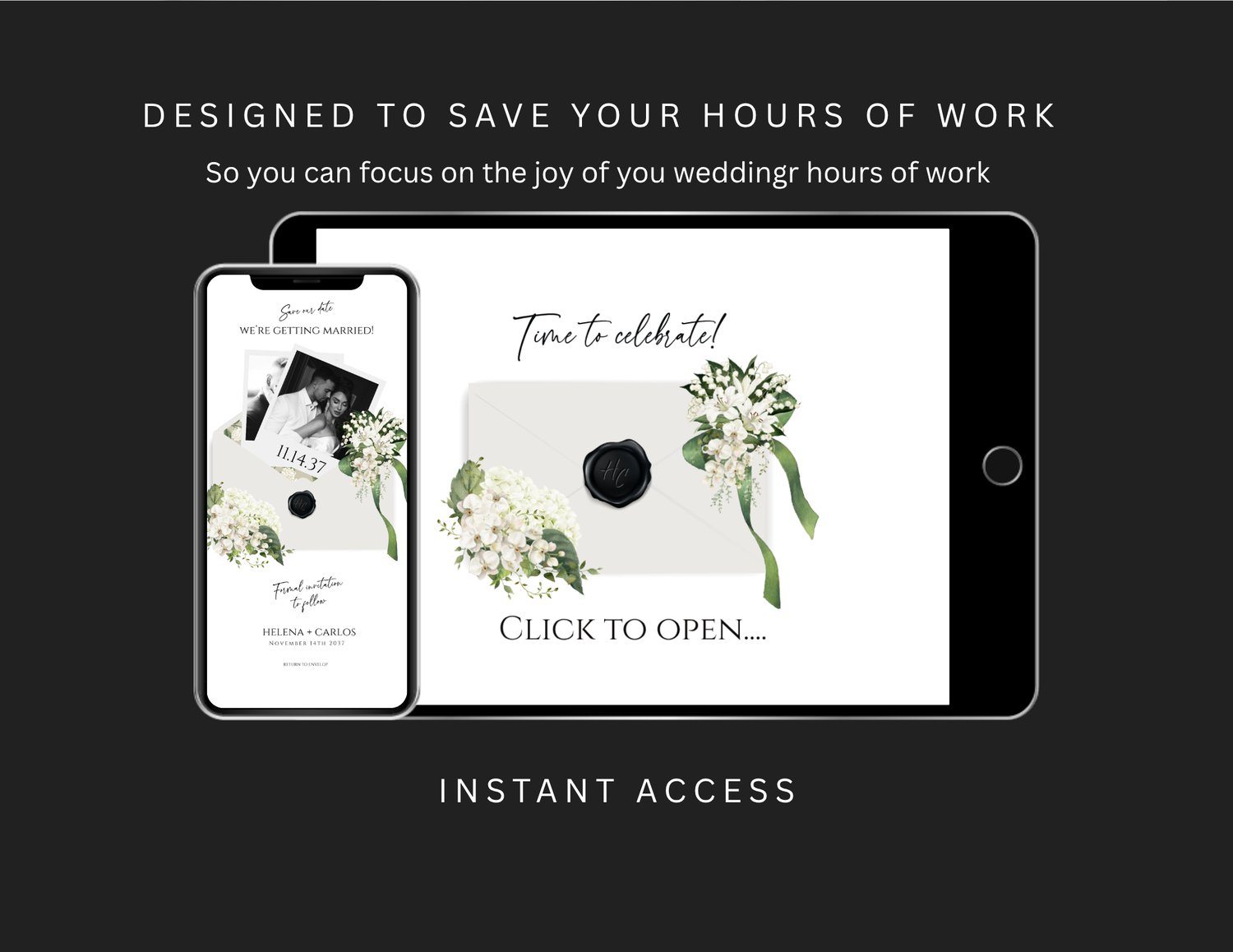 Digital Save the Date Wedding Website | Two-Page Interactive Envelope | Watercolor White Floral Greenery | Editable Canva Template