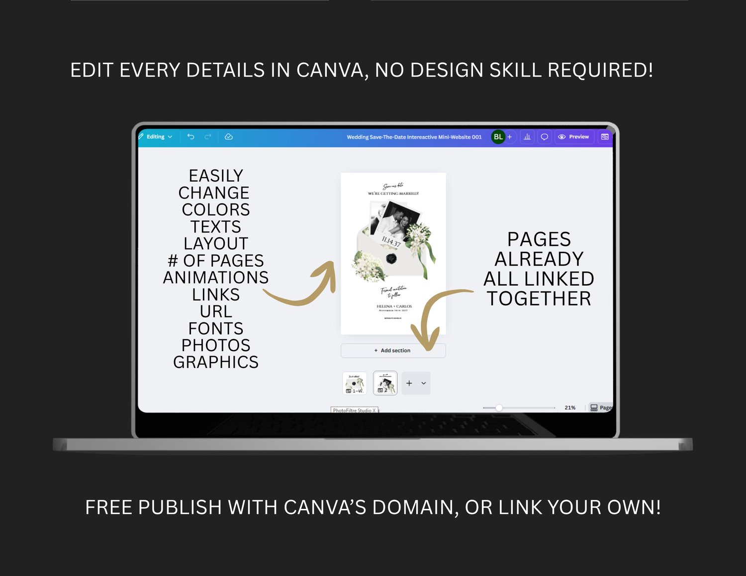 Fully editable in Canva, you can change text, fonts, colors, images, and links in minutes—no design skills required. The layout is responsive, so it looks flawless on phones, tablets, and desktops. It’s a beautiful, eco-friendly way to announce your day and send one simple link guests will love.