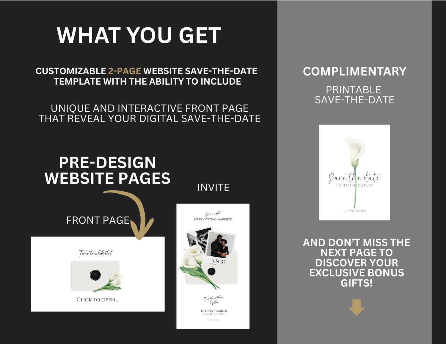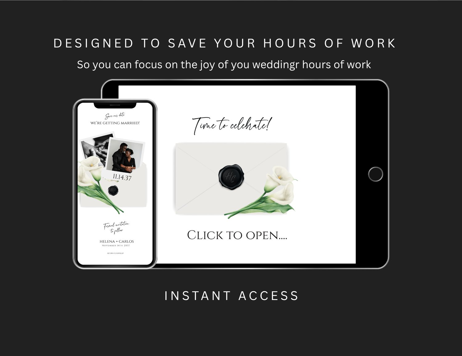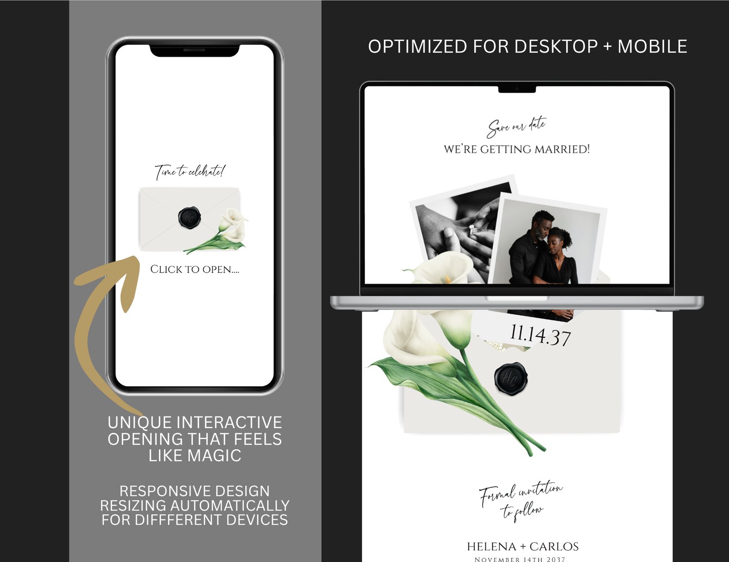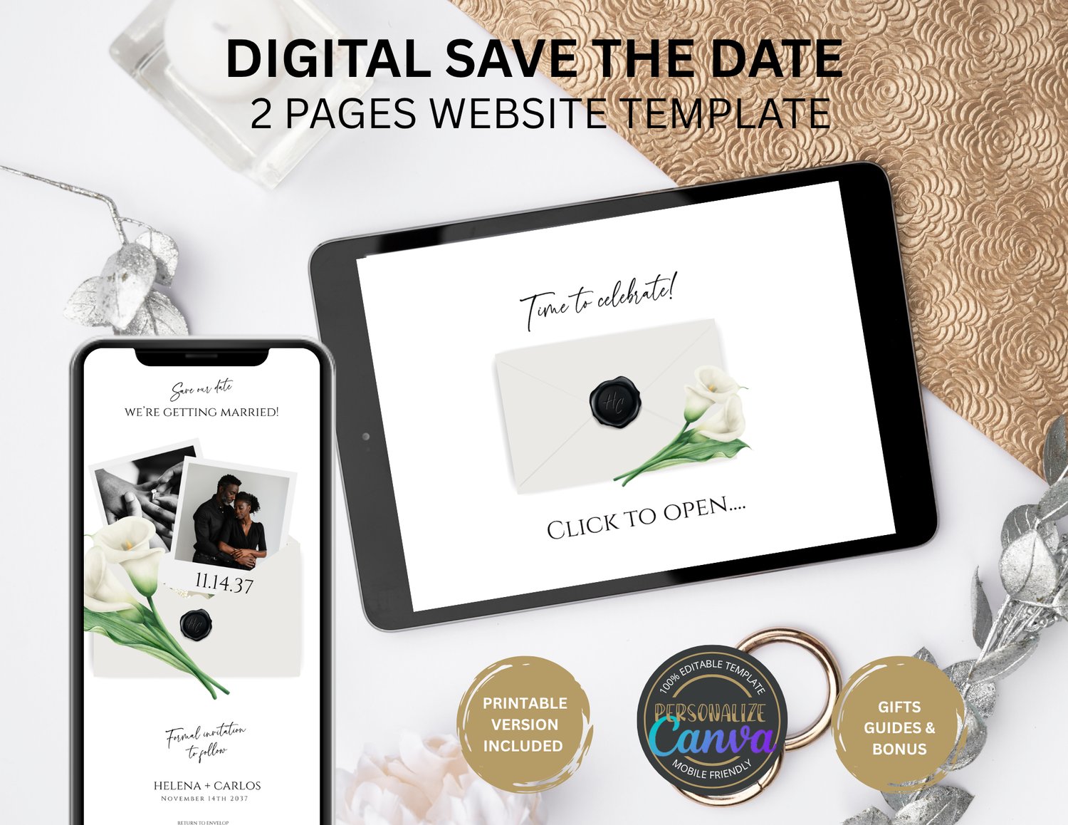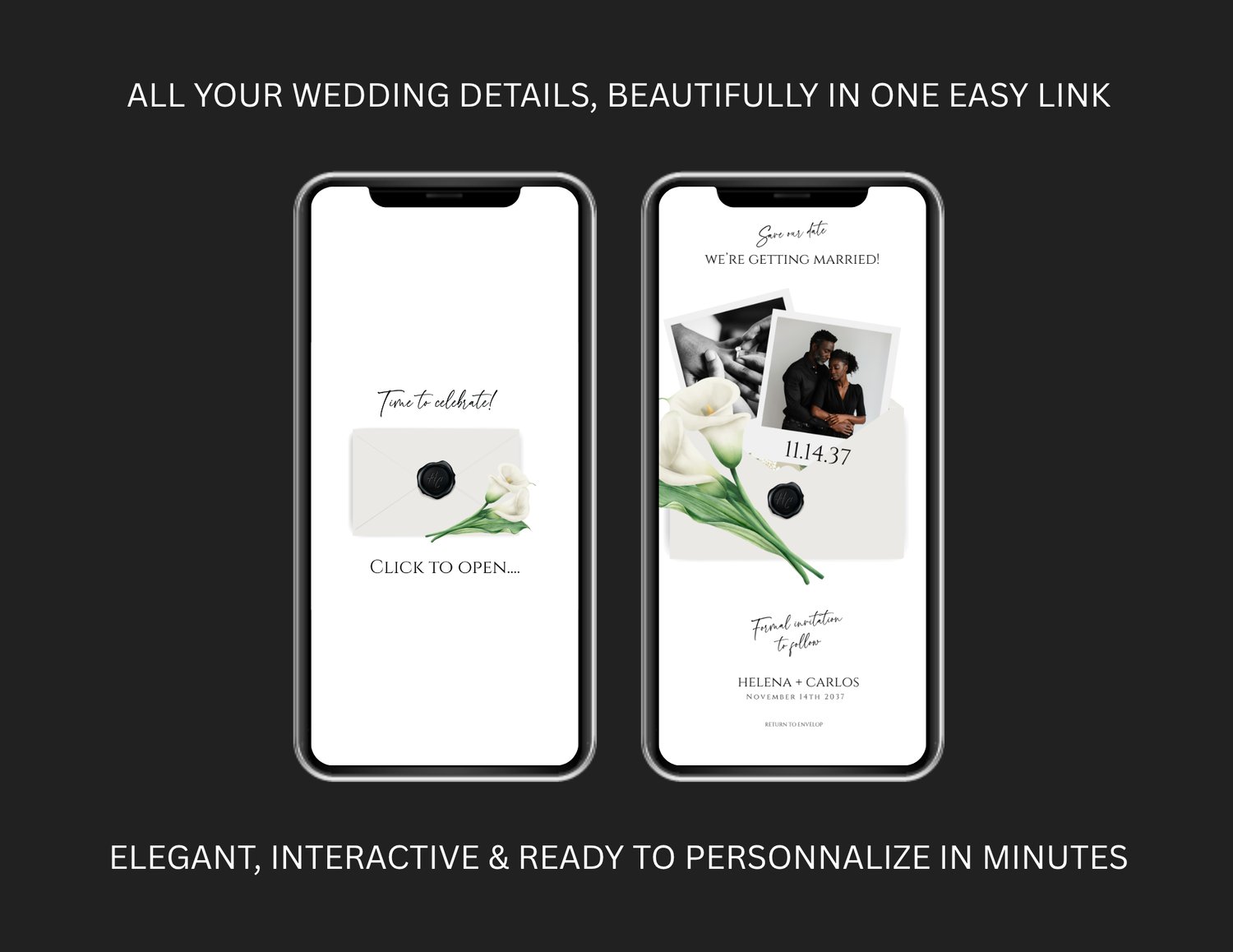 Share your date in the most elegant, modern way with this 2-Page Digital Save-the-Date Website Template, designed with graceful calla lilies, soft neutral tones, and refined script typography. The experience begins with a delicate envelope “click to open” animation, unveiling a beautifully composed Save-the-Date page where you can display your names, wedding date, and an optional photo that adds a personal touch.