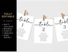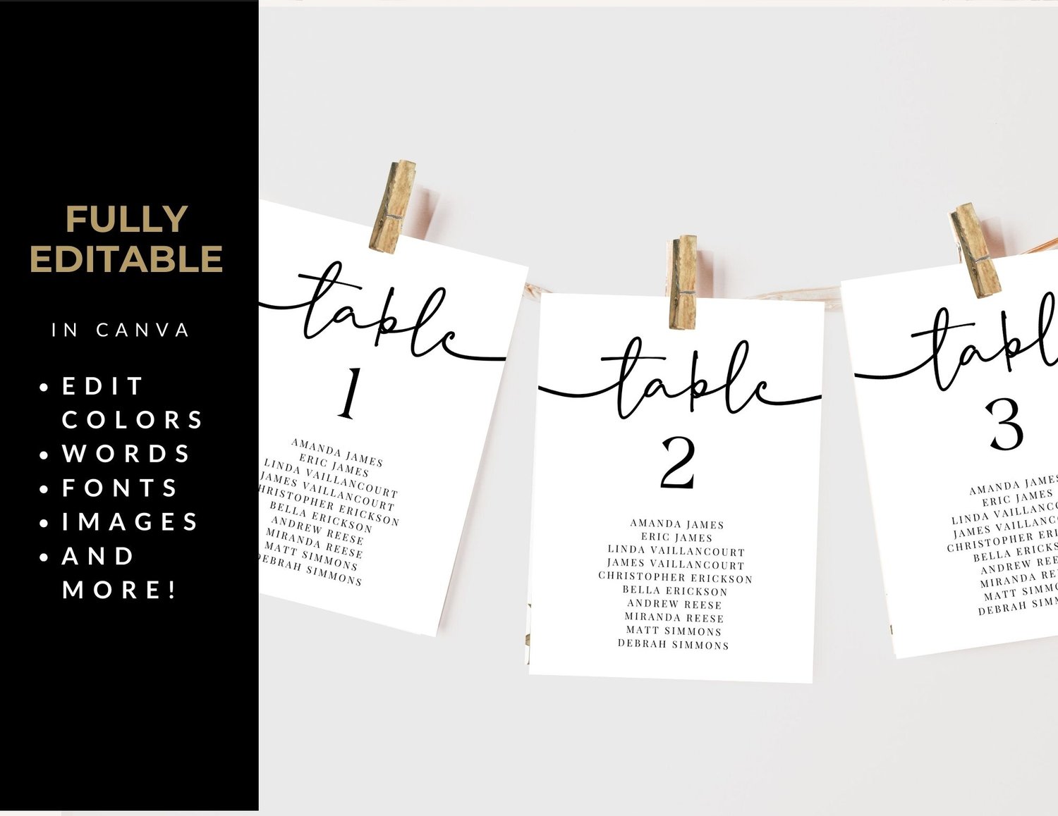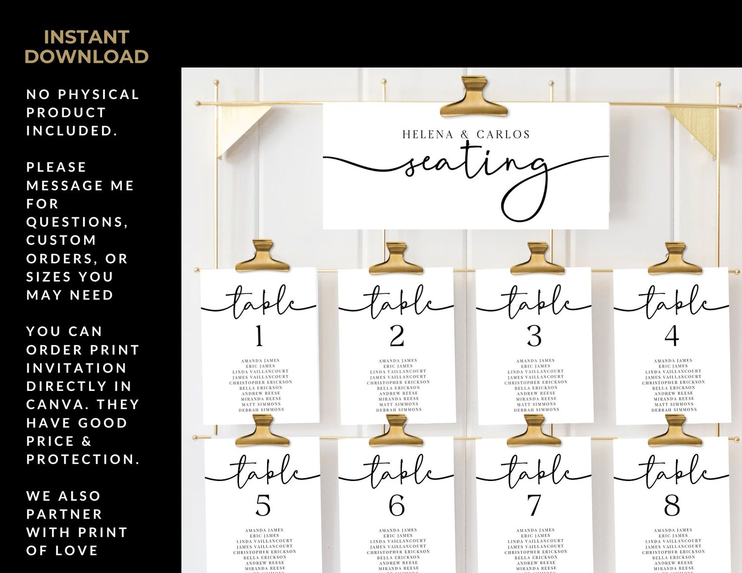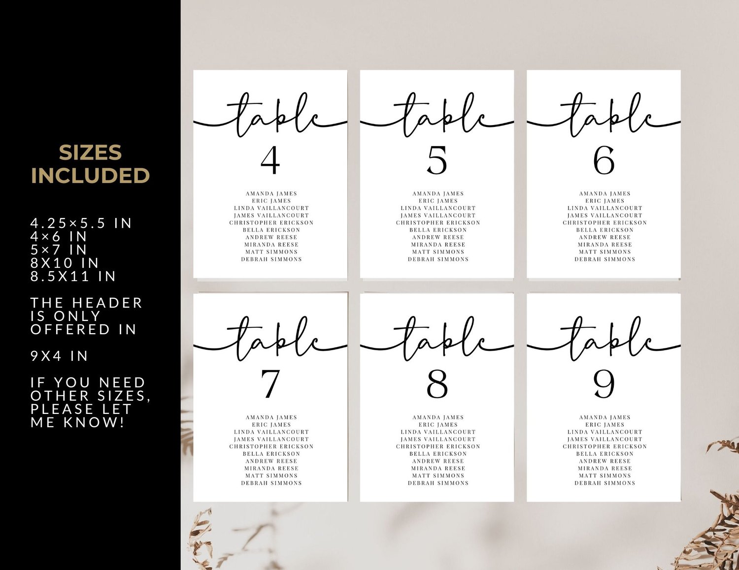 This elegant wedding seating chart template features modern calligraphy and allows you to arrange your seating plan in your own way. Available in sizes 4.25x5.5 inches, 5x7, 4x6, 8.5x11, and 8x10, with an optional 9x4 inch header, this template offers both flexibility and style to perfectly match your wedding decor.