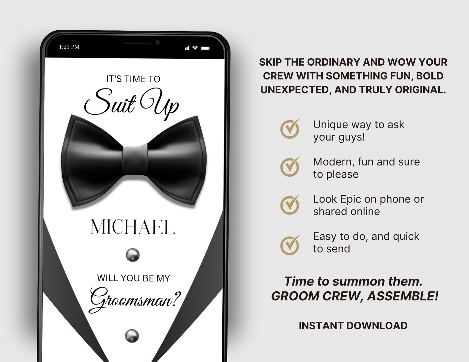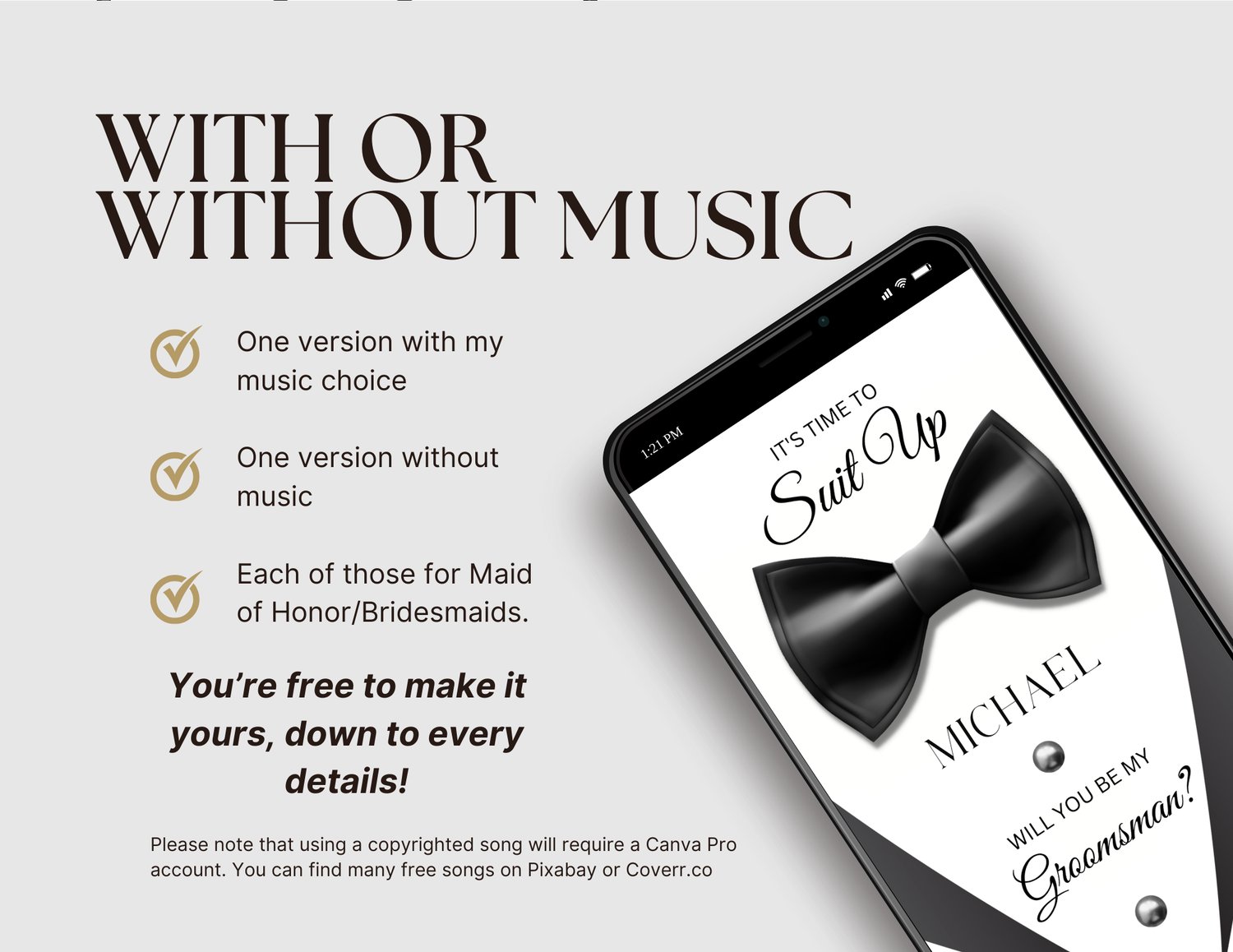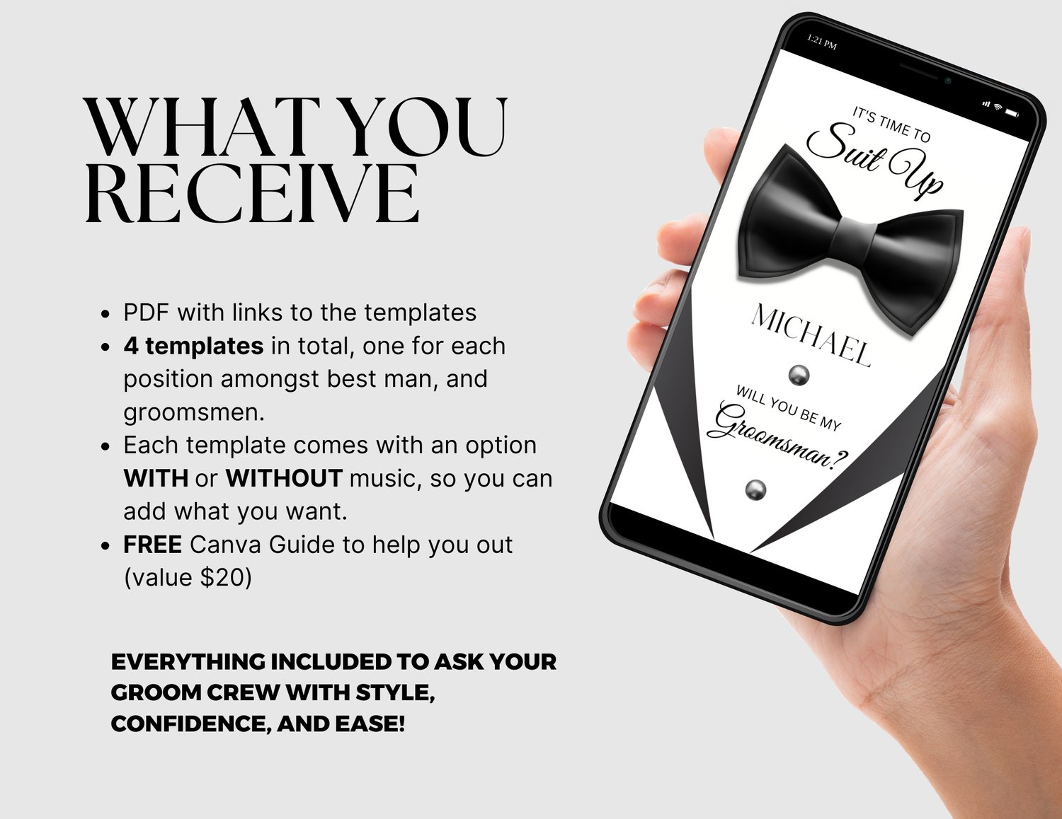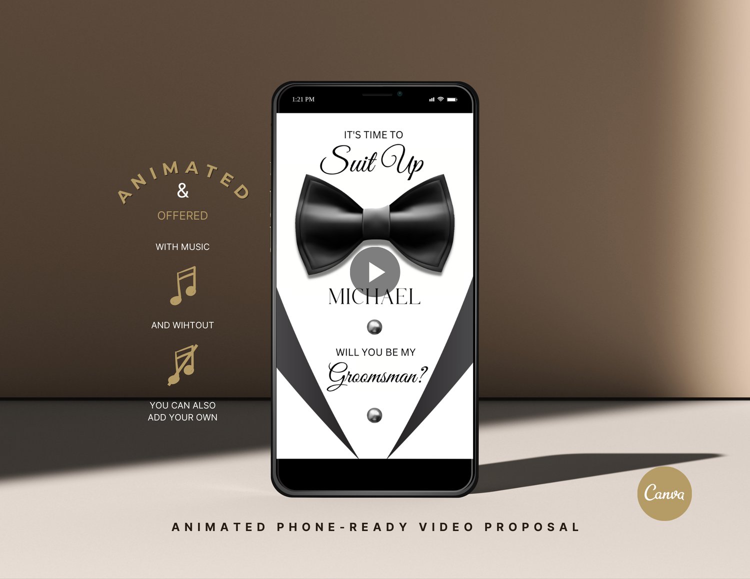 Groomsman Proposal Video Invitation | Editable Canva Template | Tuxedo & Bow Tie | Modern Cinematic Edition | GVP012