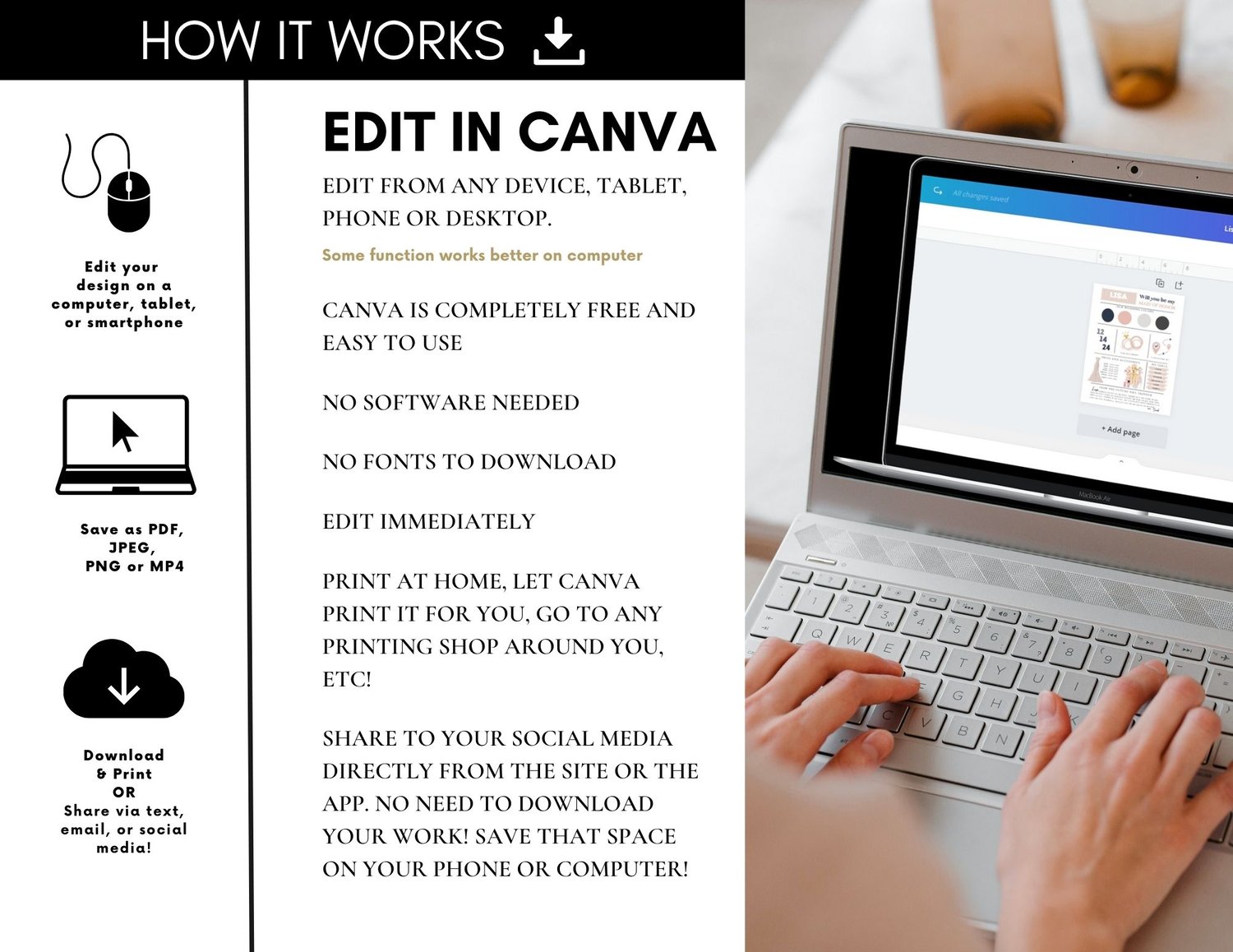 - Receive your product via a Canva link to download it in your preferred format.