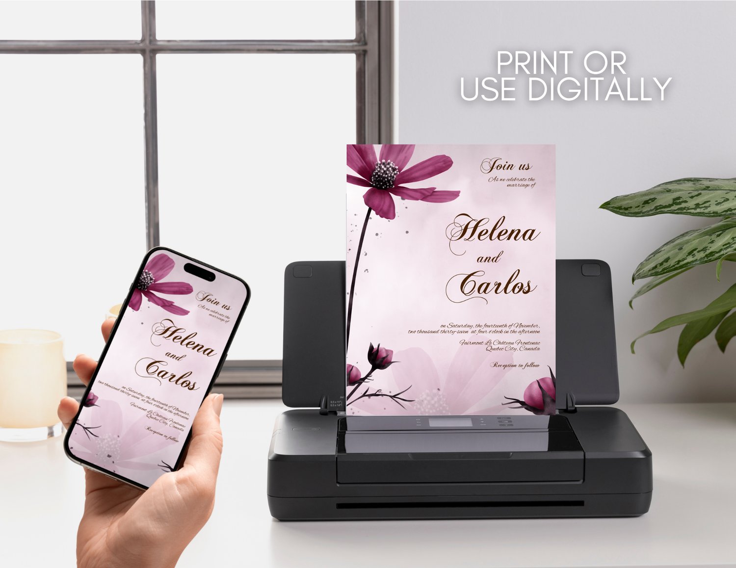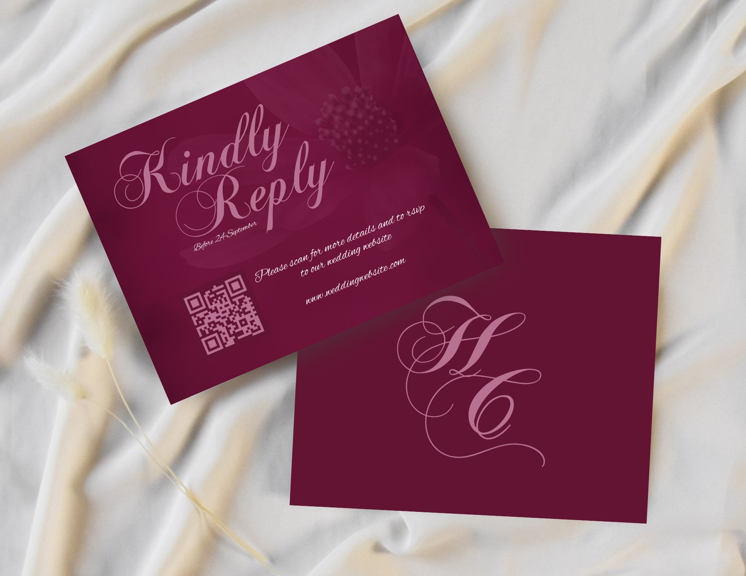 Tie your wedding stationery together with this elegant and romantic Magenta Field Wedding Bundle. Featuring rich magenta tones, soft blush undertones, and graceful script typography, this suite captures the perfect balance between modern sophistication and timeless romance. It includes everything you need to announce and organize your special day, your wedding invitation, details card, and RSVP card, all designed to coordinate seamlessly within the Magenta Field Collection.