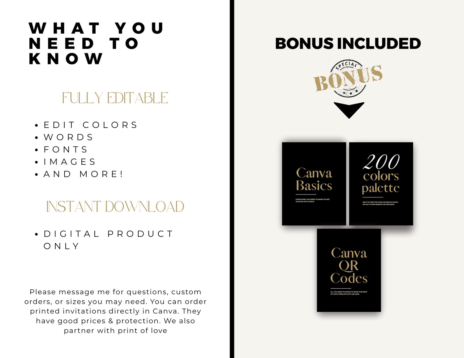 Fully editable in Canva, you can personalize every detail with ease, from names and dates to colors and fonts. Whether you’re planning a garden celebration, a chic modern soirée, or an elegant ballroom affair, this bundle brings warmth, cohesion, and artistry to your wedding paper goods.