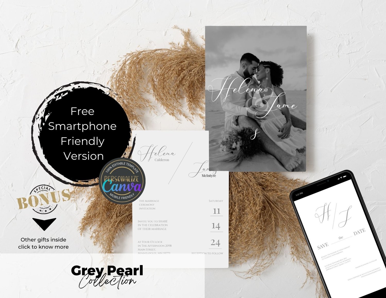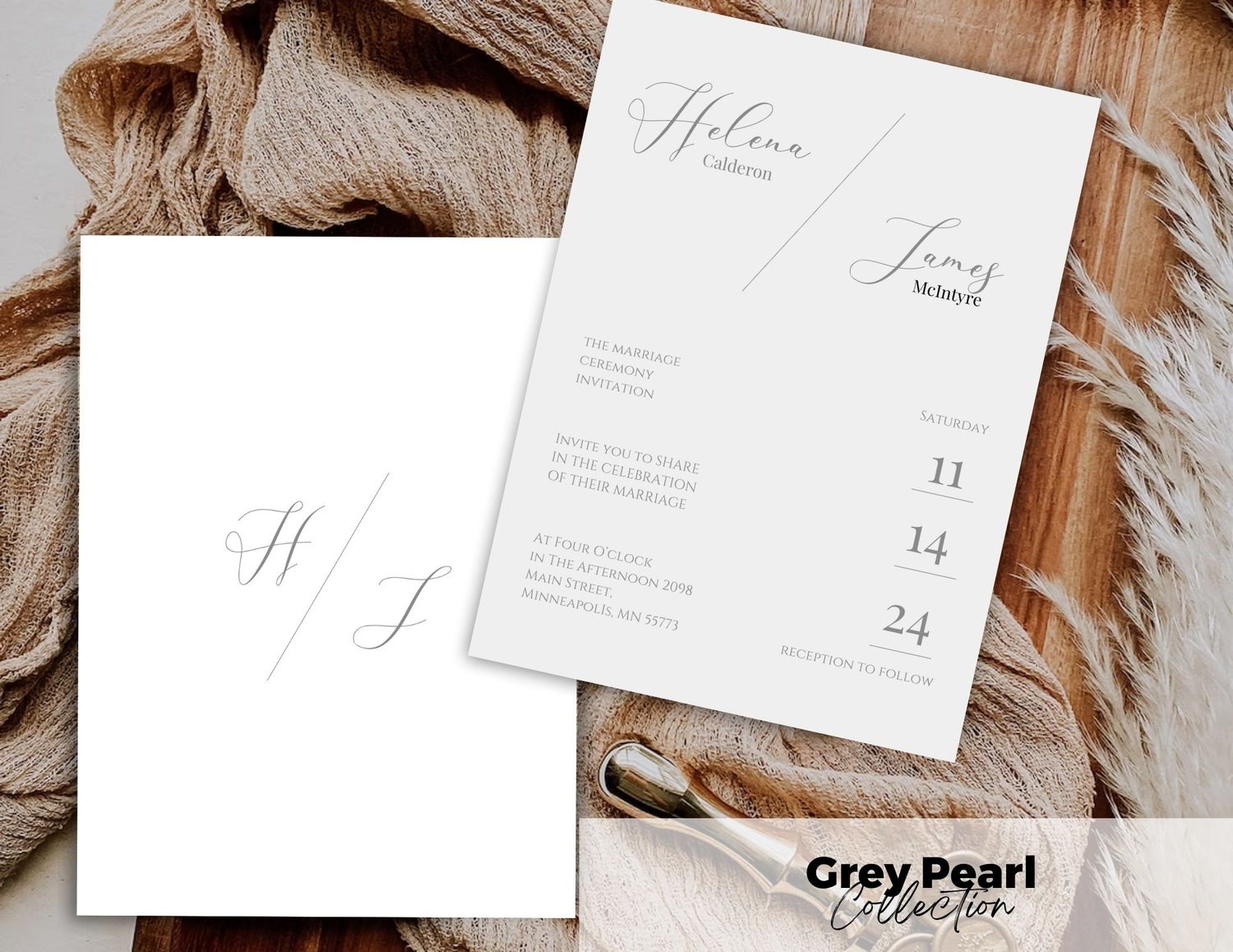 Elevate your wedding announcements with our enchanting Grey Pearl Wedding Invitation Template. Designed with a modern minimalist touch, this DIY PRINTABLE template offers a harmonious blend of beautiful fonts and customizable options, allowing you to create the perfect wedding invitation that resonates with your unique style.