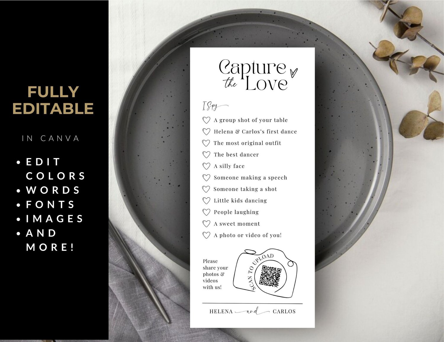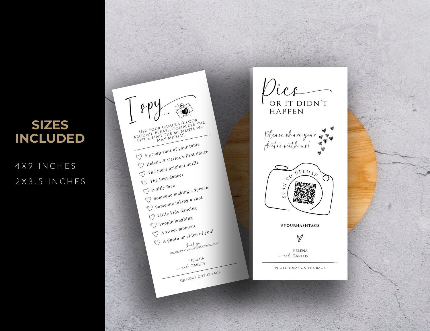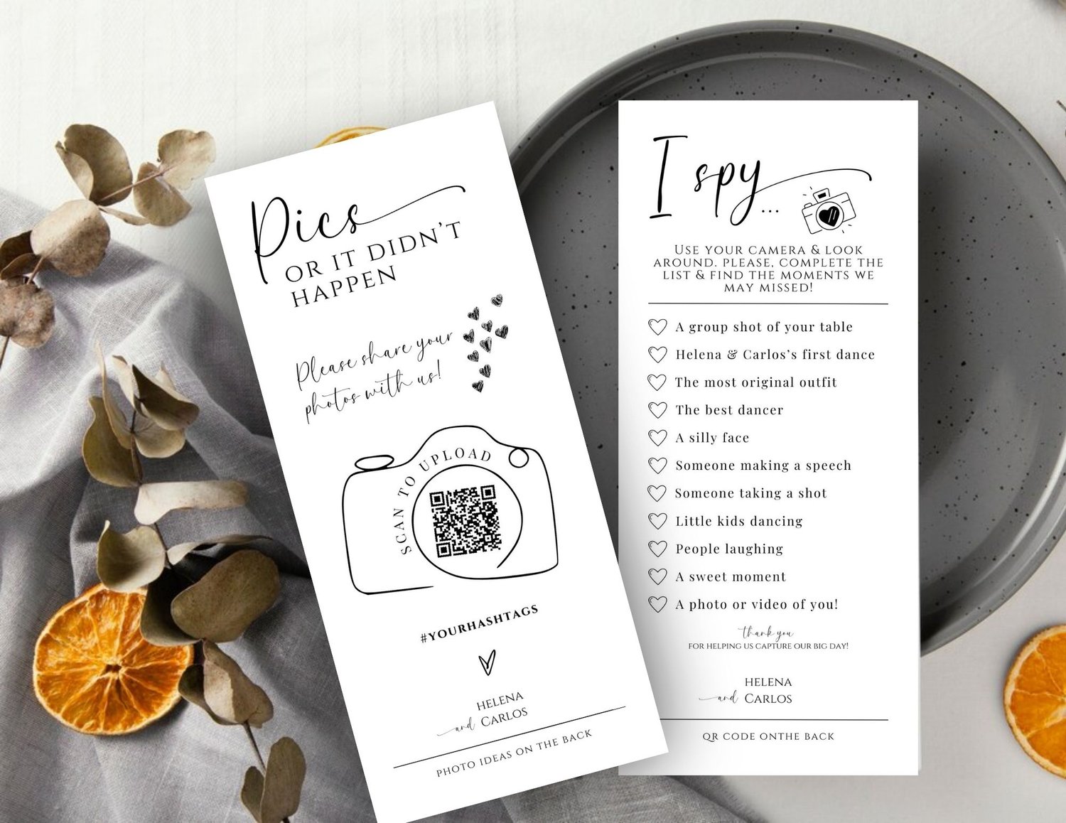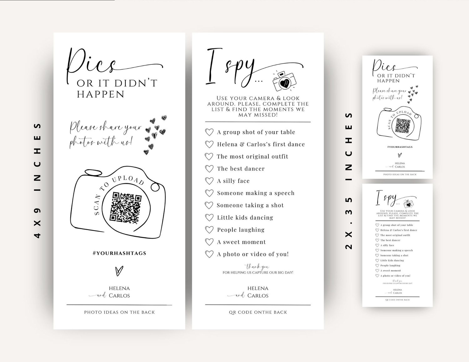 Make your wedding day unforgettable and involve everyone in creating a shared photo album filled with laughter, love, and joy. Order your I Spy Wedding Game Cards with QR Code today and add a touch of modern fun to your celebration!
